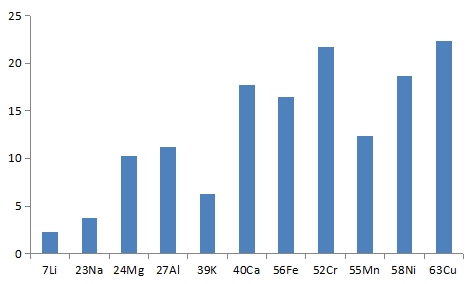 参考《GB/T 32650-2016 电感耦合等离子体质谱法检测石英砂中痕量元素》停止样品前处置。操纵冷焰形式及规范形式对样品停止测试,考查背景等效浓度(BEC)、体例检出限(D.L.)、加标收受接管率、精密度。背景等效浓度在0.6ng/L~60.0ng/L之间,体例检出限在0.3ng/L~88.2ng/L之间,加标收受接管率在82.1%~120.4%之间,精密度在1.41%~6.92%之间。