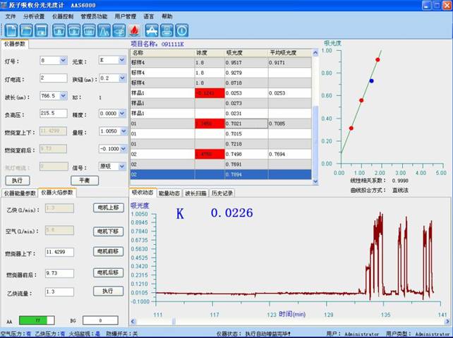 样品管理软件测试:于电子层接收到光谱分析仪激发光谱766.5nm处,利于学习气氛-乙炔烈焰,以水调零,精确测量试液的吸光度,减去伴同试料的短缺测试氢氧化钠溶液的吸光度,从作业曲网上查有出错的钾质量浓度。