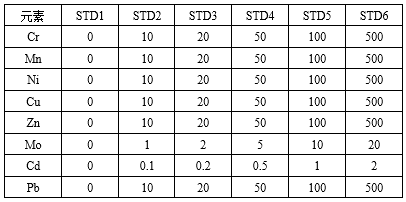 操纵逐级浓缩法,接纳1%硝酸溶液,按表2配制各待测元素规范溶液,且插手Rh元素作为内标(终究Rh浓度20μg/L)。
